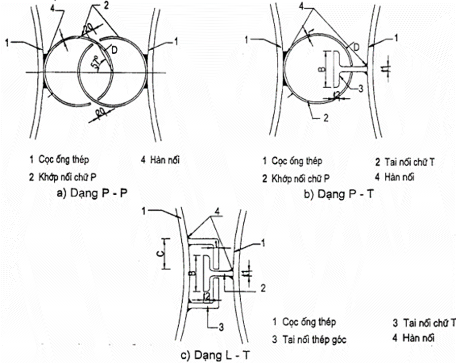 b) Kết cấu, hình dạng mặt cắt, liên kết khớp nối các loại cừ thép tham khảo Phụ lục A.