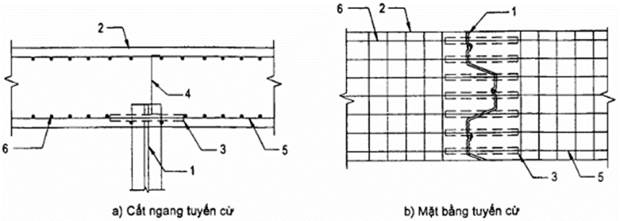 | 1 Mặt tường chống thấm; | 2 Ngăn nhựa đường; | 3 Thép máng; |