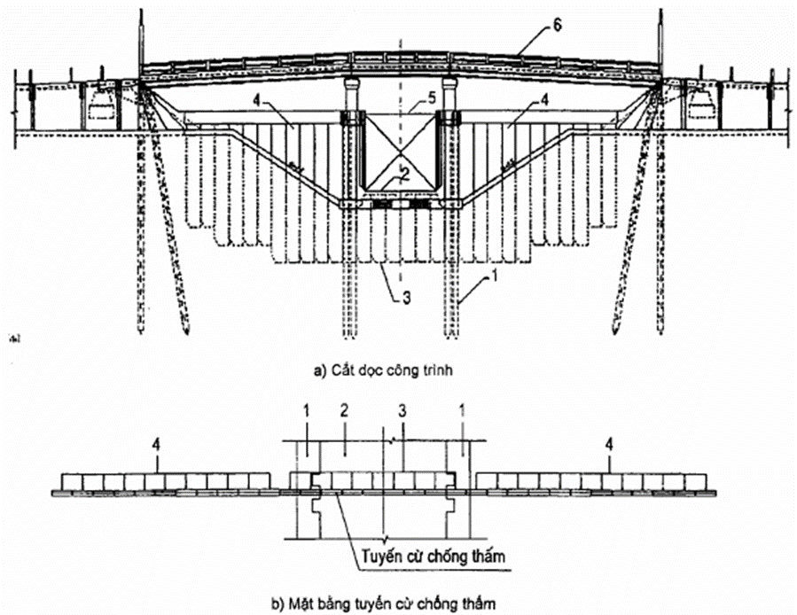 | 2 Thân công trình; | 4 Cừ chống thấm mang công trình; | 6 Cầu giao thông. |