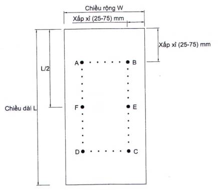 9.3 Đo chiều dày dọc theo các mép ở ít nhất bốn vị trí khác nhau, thường gần bốn góc, cách góc khoảng (25-75) mm, như nêu trong Hình 1 cho các vị trí A, B, C và D. Đo chiều dài và chiều rộng ở ít nhất hai vị trí, xấp xỉ dọc theo các đường A-B và C-D đối với đo chiều rộng và các đường A-D và B-C đối với đo chiều dài. Với các mẫu có diện tích lớn hơn 1 m2, phải thực hiện thêm hai phép đo chiều dày cho mỗi 1 m2 vượt quá. Các phép đo chiều dày này phải được thực hiện ở giữa tiết diện của mẫu - các vị trí E và F. Cũng sẽ có thêm một phép đo chiều dài hoặc chiều rộng cho mỗi mét tăng lên theo chiều dài hoặc chiều rộng khi vượt quá 1 m dài. Các vị trí thực hiện các phép đo này phải được xếp gần đều trong khu vực đo ban đầu xác định bởi A, B, C và D.