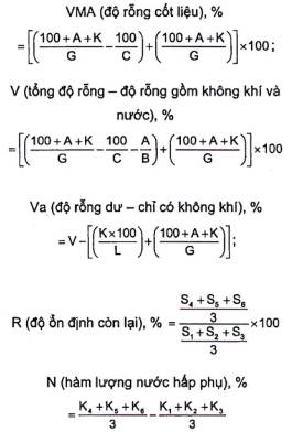 Sau khi xác định hàm lượng nước lúc thử nghiệm mẫu (K), tỷ trọng biểu kiến của cốt liệu (C), tỷ trọng của nhựa đường (B) và tỷ trọng khối của hỗn hợp (G), sẽ xác định được độ rỗng tổng cộng (V) và độ rỗng dư (Va) của mẫu thử nghiệm theo các công thức ở Bảng A.1. Độ rỗng tính cho từng mẫu riêng rẽ. Trường hợp độ rỗng của 1 trong 3 mẫu sai khác quá 50 % trị số trung bình của 3 mẫu thì loại bỏ số liệu ấy và chỉ lấy trị số trung bình của 2 mẫu còn lại.