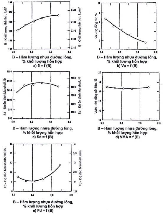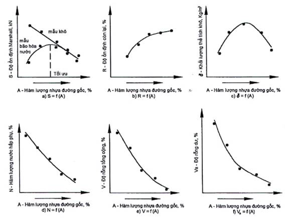 - Hỗn hợp bê tông nhựa nguội ở trong tình trạng bất lợi nhất khi bị nước tác dụng lâu dài. Vì thế chỉ tiêu quan trọng để chọn hàm lượng nhựa tối ưu là độ ổn định Marshall của mẫu khi bão hòa nước (xem Hình A.1a). Tuy nhiên người kỹ sư còn phải tăng lên hay giảm xuống một Ít hàm lượng ”tối ưu” này để các chỉ tiêu khác như hàm lượng nước hấp phụ, độ rỗng tổng cộng, khối lượng thể tích khô, độ ổn định còn lại không những nằm trong giới hạn quy định mà còn đạt các trị số tốt hơn có thể.