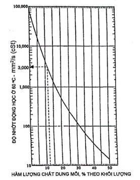 - Cũng từ Hình B.2 xác định độ nhớt ở 60 °C của MC 250 sau khi hàm lượng chất dung môi mất đi 50 % do bay hơi. Như vậy hàm lượng dung môi còn lại là 0,5 ×24 % = 12 %. Từ Hình B.2 tra ngược lại sẽ xác định được độ nhớt ở 60 °C của nhựa đường lỏng MC ấy sau khi hàm lượng dung môi chỉ còn lại 12 % là bằng 3100 cSt, tức là lúc này nhựa đường lỏng MC lúc ban đầu đã trở thành loại nhựa đường lỏng có cấp MC 3100 ở 60 °C.