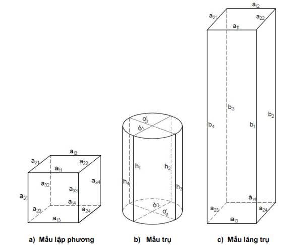 Đo kích thước các cạnh của viên mẫu theo sơ đồ Hình B.3 chính xác đến 1 mm, xác định kích thước các chiều , của viên mẫu lăng trụ theo công thức sau: