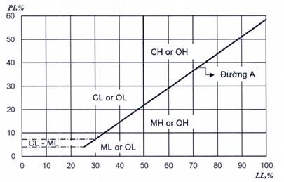 CHÚ DẪN: CH: sét - fat clay; CL: sét pha - lean clay; ML: bụi - silt; MH: bụi dẻo - elastic silt; CL-ML: sét bụi - silty clay; OH: sét hữu cơ có độ dẻo cao - organic clay with high plasticity; OH: sét hữu cơ có độ dẻo thấp - organic clay with low plasticity.