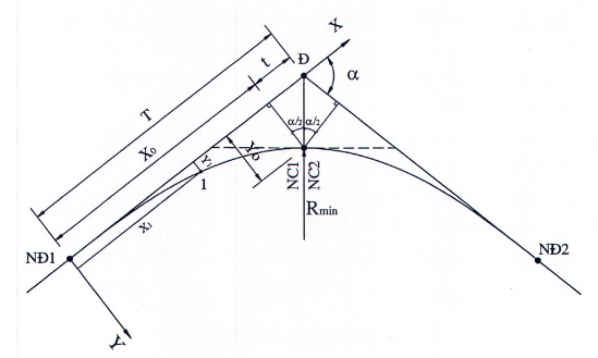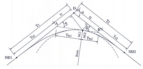 - Tính khoảng cách T từ đỉnh đến điểm nối đầu (Đ-NĐ) và xác định được điểm bắt đầu đường cong chuyển tiếp từ công thức (C.2);