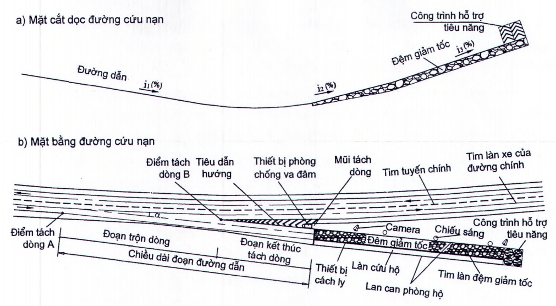 4.1 Đường cứu nạn được thiết kế và xây dựng ở những nơi có đường xuống dốc dài, độ dốc lớn như trong Bảng 1. Đường cứu nạn thường được thiết kế với các hạng mục: đoạn đường dẫn, đệm giảm tốc, đường dịch vụ (làn cứu hộ), hệ thống thoát nước, các trang thiết bị phòng hộ, chiếu sáng (xem Hình 1).