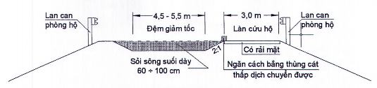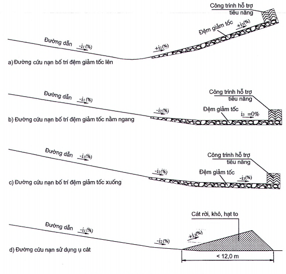 Trường hợp đường cứu nạn bố trí đoạn giảm tốc lên thì xem xét có thể bố trí một đoạn bằng tiếp giáp với công trình hỗ trợ tiêu năng để cho xe dừng lại an toàn không bị trôi lùi lại.