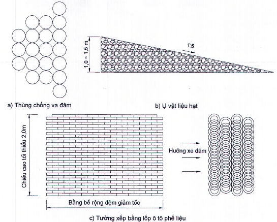 10.4 Giữa đệm giảm tốc và làn cứu hộ nên bố trí ngăn cách bằng các thùng thấp đỗ cát có thể di chuyển được thuận tiện cho các phương tiện cứu hộ tiếp cận với xe mất kiểm soát bị sự cố nằm trong đệm giảm tốc (Hình 2).