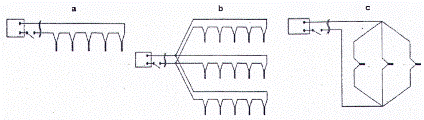 CHÚ DẪN: a là sơ đồ mắc nối tiếp các kíp điện; b là sơ đồ mắc song song - nối tiếp các kíp điện; c là sơ đồ mắc song song các kíp điện.