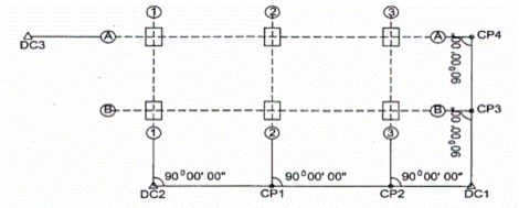 4.1.2 Để phục vụ cho công tác bố trí trục công trình nhà cao tầng và thi công cần lập một mạng lưới khống chế thi công, dưới dạng lưới độc lập. Phương vị của một trong những cạnh xuất phát từ điểm gốc lấy bằng 0°00’00” hoặc 90°00’00”. Với lưới khống chế được thiết kế theo hệ tọa độ quốc gia cần tính chuyển về múi chiếu phù hợp hoặc có thể sử dụng 1 điểm gốc và phương vị gốc.