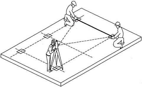 4.1.1 Tiêu chuẩn này yêu cầu các tổ, nhóm trắc địa phục vụ thi công xây dựng nhà cao tầng từ công tác thiết kế lưới khống chế thi công, chuyển bản vẽ thiết kế ra thực địa, xây dựng được hệ trục, hệ khung cho nhà cao tầng, các dạng sơ đồ đo, sai số cho phép và các loại máy móc dụng cụ được lựa chọn đảm bảo đạt được các sai số đó.