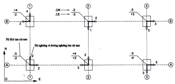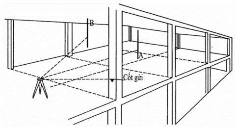5.4.3 Phương pháp mặt phẳng thẳng đứng khi sử dụng máy kinh vĩ: Tại các góc trên hai trục của công trình nằm vuông góc với nhau, chôn các mốc cố định tại các điểm A và B như Hình 18. Chu kỳ đầu, các điểm quan trắc sẽ được đánh dấu tại đỉnh và dưới tầng 1 (hoặc cốt 0,0). Độ lệch của đỉnh và tầng 1 các chu kỳ sau chính là độ nghiêng theo hướng vuông góc với mặt phẳng chiếu. Tổng hợp độ lệch tại 2 hướng chính là độ nghiêng cần xác định của điểm quan trắc.