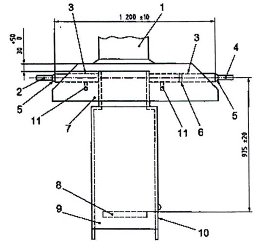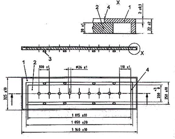Khay giữ mẫu được chế tạo từ thép chịu nhiệt tiết diện chữ L dày (2,0 ± 0,1) mm với kích thước như Hình 6. Mẫu thử được đặt lộ lửa thông qua cửa (200 ± 3) mm x (1 015 ± 10) mm. Cố định khay giữ mẫu vào mâm thép trượt bởi 2 bu lông trên mỗi đầu. Khay giữ mẫu phải có bộ phận kẹp chặt mẫu thử (ví dụ các thanh kẹp thép), có thể sử dụng tối đa 8 kẹp. Độ dày tổng của khay giữ mẫu là (22 ± 2) mm.