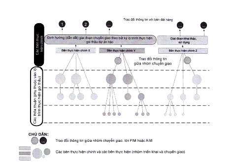 Trong quá trình quản lý thông tin, số lượng và mô tả các phần trong vòng đời tài sản (hình chữ nhật khép kín), các mốc trao đổi thông tin (hình tròn khép kín) và các thời điểm quyết định cho các nhóm chuyển giao, các bên quan tâm hoặc bên đặt hàng (hình kim cương) nên phản ánh thực tiễn địa phương, bên quan tâm và các yêu cầu của bên đặt hàng, và bất kỳ văn bản hoặc yêu cầu cụ thể nào đối với việc chuyển giao dự án hoặc quản lý tài sản.
