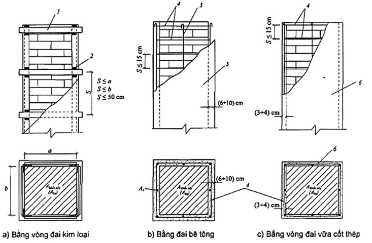 b) Khi bố trí các đai bên ngoài khối xây thì đai phải được bảo vệ bằng một lớp vữa xi măng (không vôi) dày không dưới 1 cm;