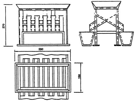 1.3.2. Rút gọn mẫu bằng thùng chứa có hai máng nhỏ theo hình vẽ. Đổ mẫu cát vào thùng chứa, san phẳng rồi mở máng cho cát chảy theo hai phía ra ngoài. Dùng một nửa (khối lượng cát của một máng) để tiếp tục rút gọn như thế cho tới khi đạt được khối lượng cần thiết kích thước mỗi máng nhỏ phải lớn hơn l,5 lần kích thước hạt cát lớn nhất.