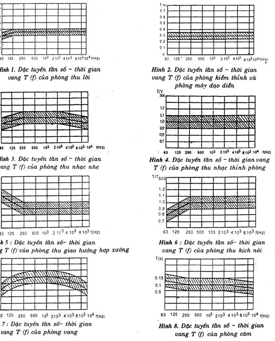 Thời gian âm vang T500 và đặc tuyến tần số của nó trong dải từ 63 Hz đến 10.000 Hz được quy định trong bảng 1 và các hình 1, 2, 3, 4, 5, 6, 7, 8 ; trong đó dung sai dưới (-) được sử dụng cho các phòng có thể tích nhỏ hơn, dung sai trên (+) được sử dụng cho các phòng có thể tích lớn hơn thể tích danh định cho trong bảng1.