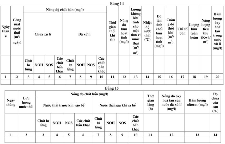 | 1 tháng 1 lần | Oxit canxi, độ cứng toàn phần, sunphat, H2S, CO2 xâm thực, chì, phôtphat, iốt, phennol, oxy hoà tan, manhe, axit flo, silic, NOH, mangan, kali, natri, đồng, kẽm, hàm lượng cặn, sinh cặn axen cácbua hyđrô thơm, sản phẩm dầu | Tổ trưởng và trưởng phòng thí nghiệm | ||
