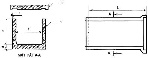 CHÚ DẪN: 1- Đốt mương; 2- Tấm đan nắp; L- Chiều dài hiệu dụng; B- Chiều rộng lòng mương; h- chiều cao lòng mương: t- Chiều dày thành; d- Chiều dày đáy.