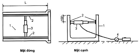 - Tại hiện trường thử nghiệm cần rải trước một xe cát vàng, đầu tiên lắp thanh giằng và dầm dưới. Lật nghiêng mương bê tông theo chiều bên một góc 90° và đặt lên trên dầm đáy sao cho mặt phẳng của miệng mương vuông góc với mặt đất, mặt cạnh của dầm đáy cách mặt phẳng của miệng mương khoảng 100 mm, cát vàng được sử dụng để điều chỉnh vị trí của mương, sao cho mặt bên của mương tiếp xúc đều đặn với dầm đáy. Sau đó phủ một lớp đệm cát lên trên mặt bên của thân mương và dọc theo thân mương cách mặt phẳng miệng mương khoảng 100 mm - 150 mm; yêu cầu là bề mặt của mặt cát phải bằng phẳng, đặt dầm giữa lên trên đệm cát, mặt bên của dầm giữa cách mặt phẳng miệng mương 100 mm, sao cho phần chịu lực của nó tương đồng với dầm đáy. Vạch các điểm chia trên dầm giữa, đặt các thanh thép truyền lực lên trên điểm vạch, đặt dầm nhỏ gia tải lên trên các thanh truyền lực, đặt kích lên chính điểm giữa của dầm nhỏ, cuối cùng đặt dầm trên lên trên cùng và vặn chặt đai ốc. Sơ đồ lắp đặt thiết bị thử nghiệm xem Hình B.1.