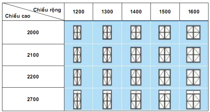 A.6. Một số kích thước thông dụng của cửa đi hai cánh mở quay được thể hiện trên hình A.6.