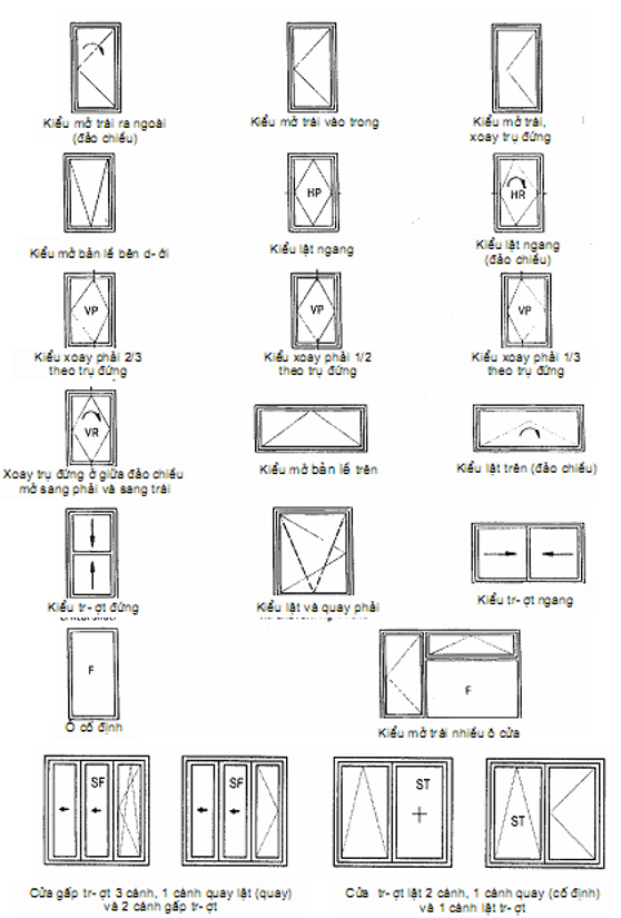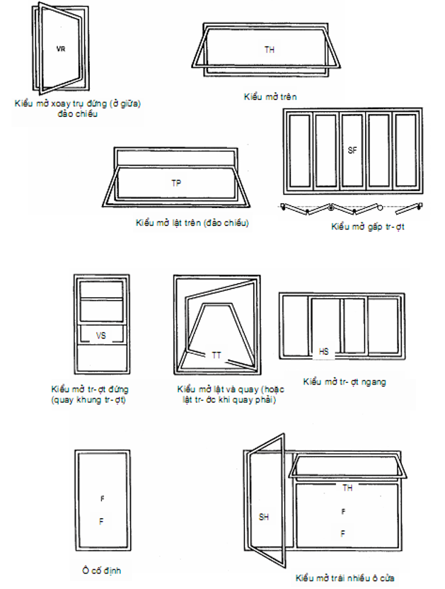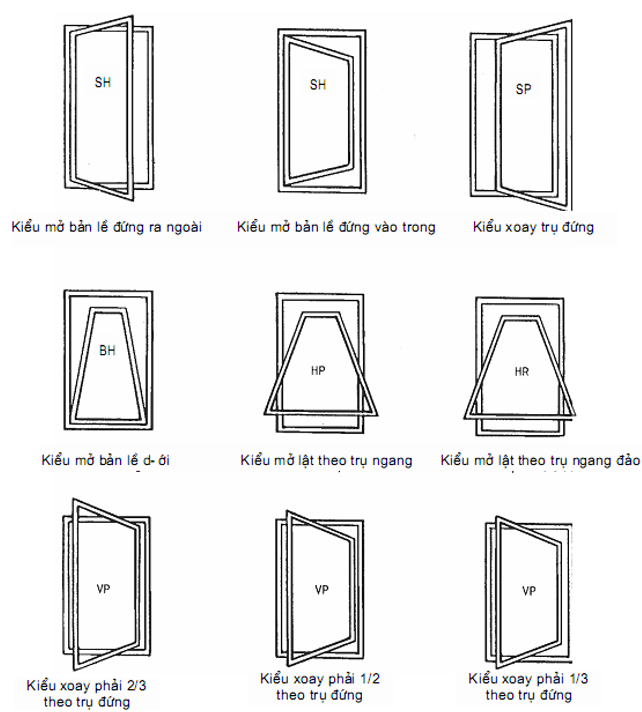 Cửa được thiết kế theo nhiều kiểu mở. Ký hiệu qui ước cho từng kiểu như sau (mô tả trên Hình 1):