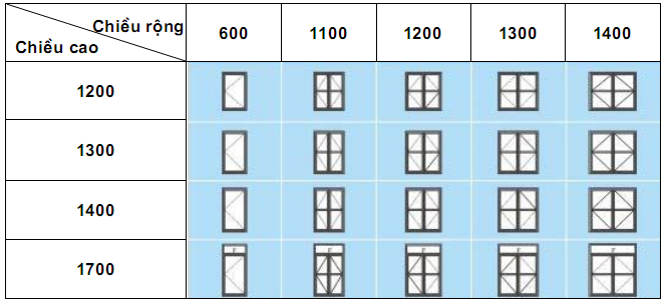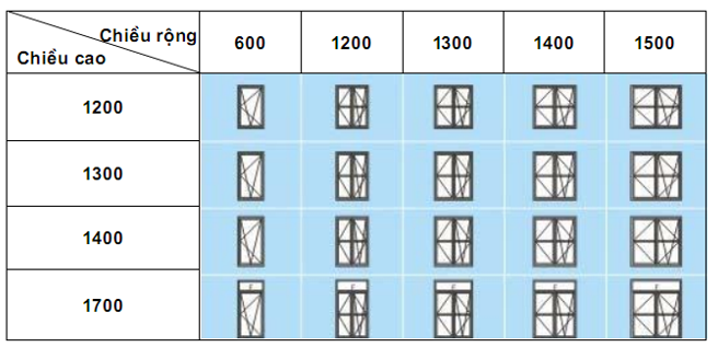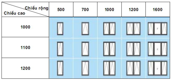 A.4. Một số kích thước thông dụng của cửa sổ mở trượt được thể hiện trên Hình A.4