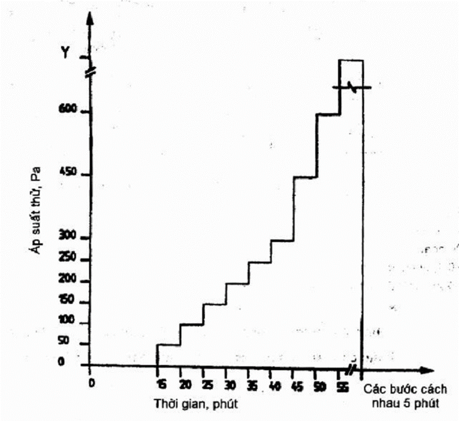 phút. Tạo áp suất thử tăng dần theo các bước, bước sau hơn bước trước là 50 Pa cho đến khi đạt 300 Pa, từ 300 Pa trở lên áp dụng mức tăng là 150 Pa. Ngay trước phép thử phải điều chỉnh lưu lượng của từng hàng vòi theo 5.6.
