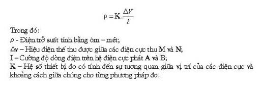 1.10. Để xác định điện trở suất của các lớp đất đá phải đo giá trị hiệu điện thế, cường độ dòng điện và khoảng cách giữa các điện cực. Công thức tính giá trị điện trở suất được biểu diễn như sau.