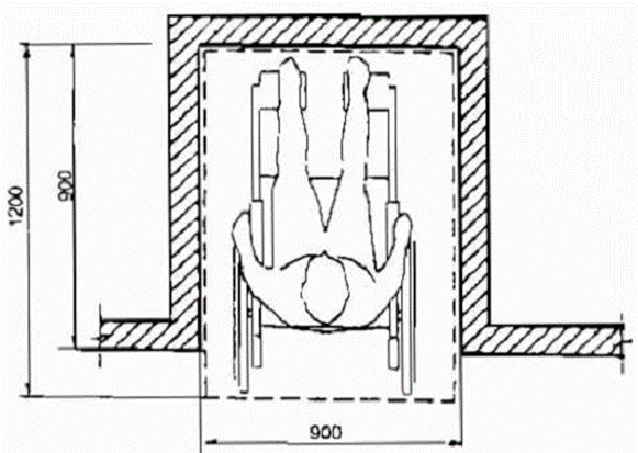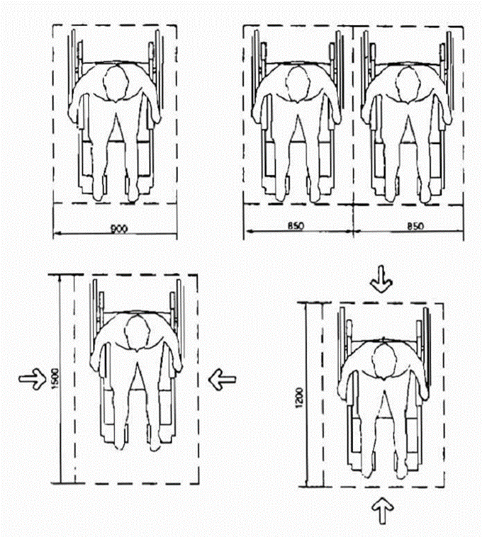 Ở những nơi xe lăn có thể đi vào từ phía trước hay phía sau thì khu vực dành cho xe lăn phải đảm bảo không nhỏ hơn 1200mm. Ở những nơi xe lăn có thể đi vào từ hai bên thì cho phép là 1500mm (xem hình 51).