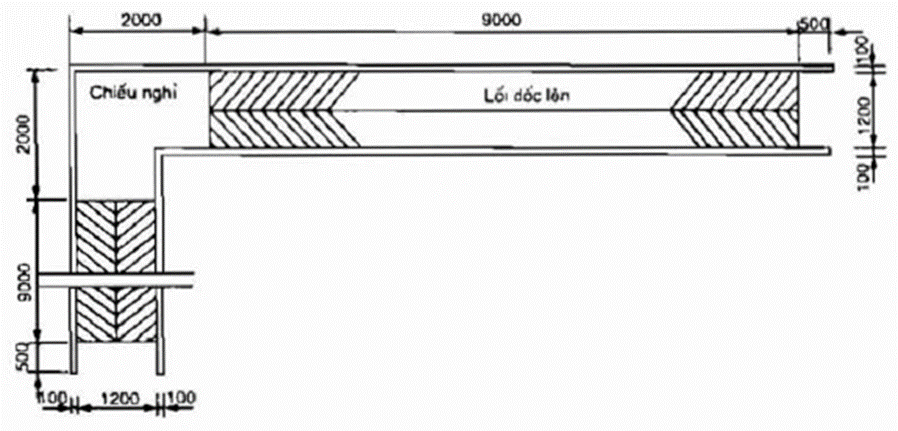 1) Khi đường dốc chuyển hướng phải bố trí chiếu nghỉ hình chữ L mỗi chiều dài 2000mm.