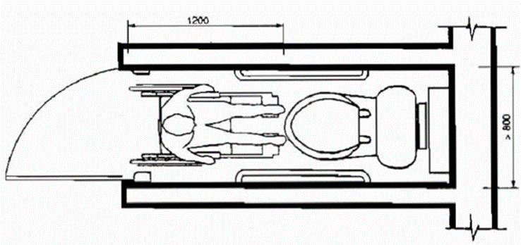 Kích thước không gian thông thủy chỗ ngồi dành cho người đi xe lăn có chiều rộng từ 800mm đến 900mm và có chiều dài từ 1100mm đến 1400mm (xem hình 53).