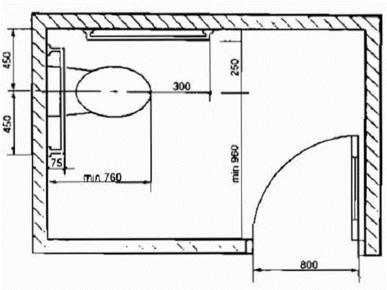 5.11.7. Trong phòng tắm cần bố trí chỗ ngồi cho người tàn tật. Ghế ngồi có dạng hình chữ L và hình chữ nhật được gắn hoặc ghép thành khối cố định hoặc không cố định. Trong phòng tắm dùng vòi hoa sen ghế được lắp dưới dạng ghế gập được gắn cố định trên tường. Đối với phòng tắm có bồn thì ghế ngồi được bố trí ở phía đầu của bồn tắm hoặc ở trên mặt bồn. Chỗ ngồi phải được gắn an toàn và không bị trượt trong quá trình sử dụng. Mặt ghế cách mặt sàn từ 400mm đến 450mm.