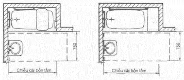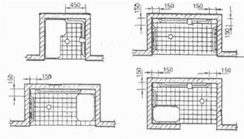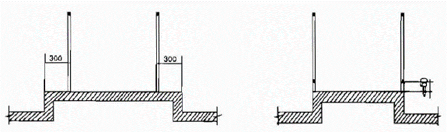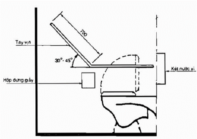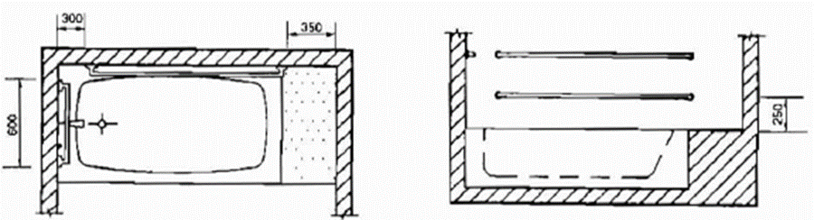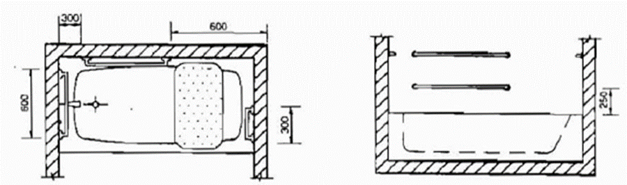 b) Bồn tắm không có ghế cố định: các tay vịn được gắn trên tường như quy định ở a). Ngoài ra phía trên tường đầu bồn tắm có lắp một tay vịn dài 300mm tính từ mép tường ngoài (xem hình 48).