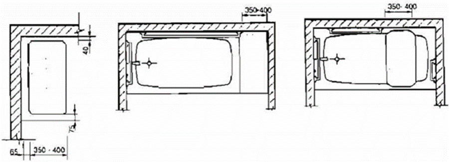 5.11.8. Khi lắp đặt ghế ngồi dạng hình chữ nhật thì mép sau của ghế cách mặt tường kề sát không lớn hơn 65mm. Đối với phòng tắm dùng vòi hoa sen di động thì các mép bên của ghế cách mặt tường kề sát không nhỏ hơn 40mm. Chiều rộng mặt ghế từ 350mm đến 400mm (xem hình 49).