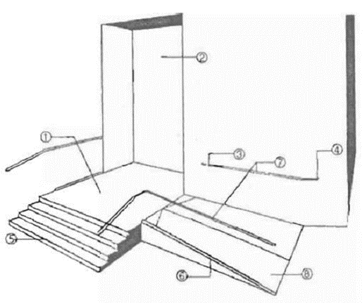 1. Kích thước nhỏ nhất của khoảng không trước lối vào (1500mm x 1500mm); 2. Cửa lối vào đặt trong hốc tường; 3. Tay vịn kéo dài ở đỉnh đường dốc; 4. Tay vịn kéo dài ở chân đường dốc; 5. Lối vào có bậc; 6. Lề đường; 7. Tay vịn bố trí ở độ cao 900mm; 8. Đường dốc có độ dốc 11/12 rộng 1200mm