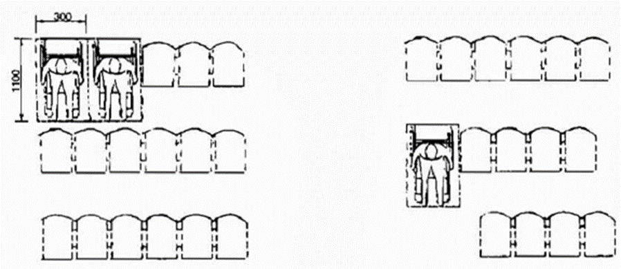 Chú thích: Đối với chỗ để xe ôtô cần bố trí khoảng không gian thông thủy ở bên cạnh hoặc ở phía sau xe để người tàn tật đi xe lăn lên xuống. Chiều rộng từ 900mm đến 1200mm (đối với xe buýt là 2500mm). Nếu bố trí hai xe liền nhau thì có thể dùng chung một đường cho xe lăn (xem hình 8).