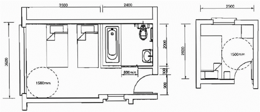 5.12.3.4. Khi bố trí giường phải để một khoảng không gian rộng 1500mm x 1500mm về một phía của giường để người đi xe lăn có thể quay xe lăn hoặc di chuyển xe lăn. Giường ngủ có chiều cao phù hợp với người tàn tật, thông thường nhỏ hơn hoặc bằng 450mm. Phòng ngủ phải được bố trí thuận tiện với các phòng khác của ngôi nhà (xem hình 55).