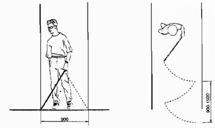 Chiều rộng khi di chuyển với độ khua của gậy không nhỏ hơn 900mm và chiều dài dao động của gậy từ 900mm đến 1500mm.