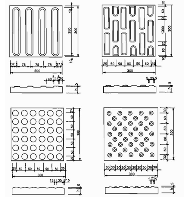 5.12. Các tấm lát dẫn hướng có cảm giác được thể hiện trên hình 7 (trong đó loại tròn thường được sử dụng ở nơi ẩm ướt). Vật liệu sản xuất các tấm lát phải không trơn trượt.