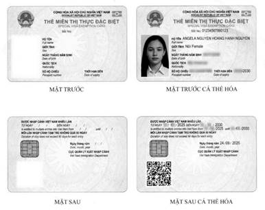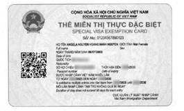 - Hình Quốc huy nước Cộng hòa xã hội chủ nghĩa Việt Nam và ảnh khuôn mặt của người được cấp thẻ miễn thị thực đặc biệt được in màu trực tiếp trên thẻ.