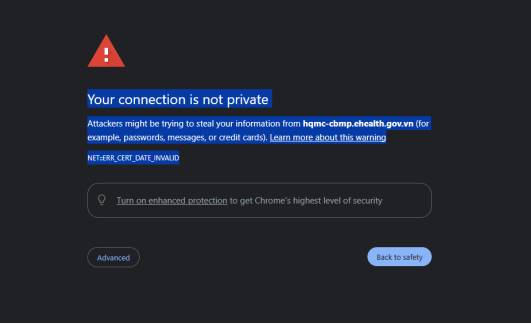 - Tên miền hết hạn chứng chỉ bảo mật SSL, dẫn đến hệ thống bị chặn kết nối và không cho phép người dùng truy cập. Khi truy cập, trình duyệt hiển thị thông báo cảnh báo: “Your connection is notprivate Attackers might be trying to steal your information from hqmc-cbmp.ehealth.gov.vn (for example, passwords, messages, or credit cards). Learn more about this warning net::ERR CERT DATE INVALID”.