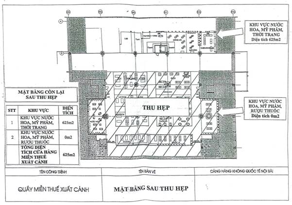 - Khu vực quầy miễn thuế xuất cảnh: tại vị trí E03-W03, tầng 3 nhà ga hành khách T2, Cảng hàng không sân bay quốc tế Nội Bài, diện tích sau khi thuhẹp là 625 m2;