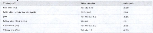 * Đánh Giá Cảm Quan: Hình thức & Màu sắc: Màu nâu, không vón cục, không lẫn tạp chất Khả năng hòa tan: Trong nước nóng: Dưới 30 giây với khuấy vừa phải → Đạt Trong nước lạnh: Dưới 3 phút với khuấy vừa phải → Đạt * Tạp chất: không có * Thời hạn sử dụng sản phẩm: 24 tháng kể từ ngày sản xuất. * Điều kiện bảo quản: Bảo quản nơi khô ráo, sạch sẽ, thoáng mát ở nhiệt độ môi trường * Quy cách đóng gói: 25 kg cà phê tịnh, đóng trong thùng carton xuất khẩu, bên trong có túi PE hai lớp + Vai trò và công dụng của maltodextrin brown đối với mặt hàng là chất độn phổ biến được sử dụng trong ngành cà phê hòa tan, điều chỉnh vị đắng của cà phê, làm tăng khối lượng sản phẩm mà không thay đổi mục đích sử dụng của sản phẩm. Việc thêm 20% maltodextrin brown không làm thay đổi cách sử dụng của sản phẩm. Maltodextrin brown không bổ sung hương liệu tổng hợp. - Quy trình sản xuất: Bước 1 - Bước 2: Tiếp nhận và Kiểm tra chất lượng: Hoạt động tiếp nhận + kiểm tra chất lượng đầu vào các nguyên liệu/ bao bì từ NCC vào kho nhà máy Bước 3: Lưu kho lần 1: Hoạt động lưu trữ NVL (nguyên vật liệu) sau khi nhận vào từ NCC (nhà cung cấp) Bước 4: cấp phát NVL: cấp phát NVL, bao bì từ kho NVL cho sản xuất Bước 5: Chuẩn bị: Chuẩn bị NVL, bao bì sẵn sàng cho sản xuất Bước 6: Định lượng lần 1: Chuẩn bị đúng tỉ lệ các thành phần nguyên liệu cho công đoạn tiếp theo. Nguyên liệu đầu vào là bột cà phê hòa tan và brown maltodextrin đã được định lượng sẵn theo tỷ lệ (80% cà phê hòa tan + 20% brown maltodextrin). Bước 7: Kiểm tra lần 2: Kiểm tra đầy đủ các loại nguyên liệu đúng theo công thức Bước 8: Lưu kho lần 2: Những batch đã chuẩn bị đúng công thức được lưu tạm trong khu vực chờ phối trộn Bước 9: Nạp liệu: Chuyển từng mẻ trộn theo đúng công thức đã chuẩn bị sẵn vào tank chứa tạm Bước 10 - Bước 11: Sàng + Tank chứa tạm: Sử dụng sàng nhằm loại bỏ những yếu tố ngoại lai và những nguyên liệu có kích thước lớn. Nguyên liệu sau khi sàng lọc sẽ được chuyển vào tank chứa tạm để chờ cho vào bồn trộn Bước 12: Trộn (không phun hương liệu): Nguyên liệu cà phê hòa tan / Brown maltodextrin trong tank chứa tạm được xả vào máy trộn hình trụ. Hệ thống máy trộn được thiết lập thời gian trộn tự động để thực hiện phối trộn cho đến khi các nguyên liệu đồng nhất. Maltodextrin brown sử dụng trong sản phẩm là một nguyên liệu thực phẩm, được trộn với cà phê hòa tan (sau khi cà phê đã được sấy phun). Bước 13: Kiểm tra lần 3: Kiểm tra các chỉ tiêu chất lượng của mẻ trộn sau khi hoàn thành Bước 14: Tank đóng gói: Nếu tất cả các chỉ tiêu chất lượng sau khi kiểm tra đều đạt, bột sẽ được xả vào tank chứa thành phẩm Bước 15: Định lượng lần 2: Nếu tất cả các chỉ tiêu chất lượng sau khi kiểm tra đều đạt, bột sẽ được xả vào tank chứa thành phẩm Bước 16: Làm kín bao bì: Sau khi đóng gói, bao PE được làm kín bằng dây rút Bước 17: Đóng thùng: Sản phẩm được đóng gói cấp 2 trong thùng carton, kích thước tùy theo sản phẩm. Bước 18: Xếp pallet: Sản phẩm sau khi đóng gói được xếp pallet theo quy cách đã qui định cho mỗi loại sản phẩm Bước 19: Kiểm tra lần 4: Đảm bảo sản phẩm được đóng gói theo đúng quy cách (khối lượng, code date, độ kín). Nếu kiểm tra không đạt sẽ được tách riêng để định lượng và đóng gói lại. Bước 20: Lưu kho và bảo quản: Thành phẩm sau khi chất xếp gọn gàng trên pallet được quấn màng co và dán nhằn kiểm soát đầy đủ thông tin sẽ được nhập kho để bảo quản Bước 21 - Bước 24: Các bước tiếp nhận, kiểm tra, lưu kho, cấp phát áp dụng cho bao bì. Bước 25 - Bước 27: Các bước lưu trữ, kiểm tra, định lượng áp dụng cho các nguyên vật liệu và bao bì được tái chế Bước 28: Tập kết rác sau khi hoàn thành quy trình sản xuất. - Cơ chế hoạt động, cách thức sử dụng, công dụng theo thiết kế: Nguyên liệu dùng trong công nghiệp chế biến thực phẩm. Cụ thể đây là nguyên liệu thô trong sản xuất cà phê đen, cà phê 2 in 1, hoặc cà phê 3 in 1... tùy vào nhu cầu của khách hàng. | ||||||