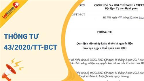 Ngày 04/12/2020, Bộ Công Thương ban hành Thông tư 43/2020/TT-BCT quy định việc nhập khẩu thuốc lá nguyên liệu theo hạn ngạch thuế quan năm 2021.
