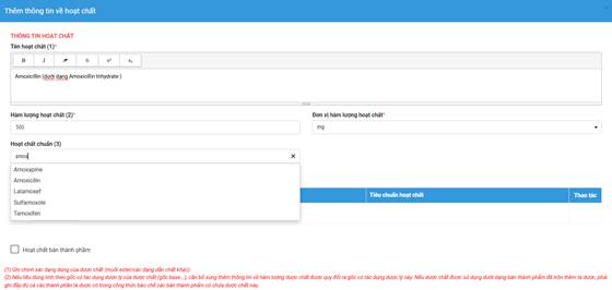 Thuốc có nhiều thành phần hoạt chất, đề nghị lựa chọn đầy đủ các tên hoạt chất chuẩn đăng ký trong hồ sơ.