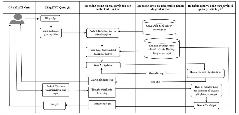 8.1. Phương án 1: Tích hợp Hệ thống dịch vụ công trực tuyến quản lý thiết bị y tế với Hệ thống thông tin giải quyết TTHC Bộ Y tế (HTTTGQTTHC), thực hiện lấy dữ liệu từ Cơ sở dữ liệu quốc gia về đăng ký doanh nghiệp thông qua HTTTGQTTHC Bộ Y tế.