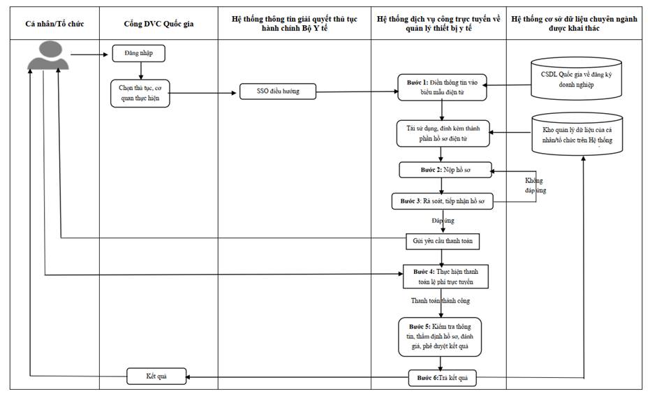 + Sau khi Công dân, tổ chức thực hiện thanh toán trực tuyến trên Cổng dịch vụ công quốc gia, hệ thống tự động chuyển thông báo thanh toán thành công đến Hệ thống thông tin giải quyết thủ tục hành chính của Bộ Y tế và Hệ thống dịch vụ công trực tuyến về quản lý thiết bị y tế, cán bộ tiếp nhận sẽ chuyển hồ sơ đến bộ phận thẩm định.