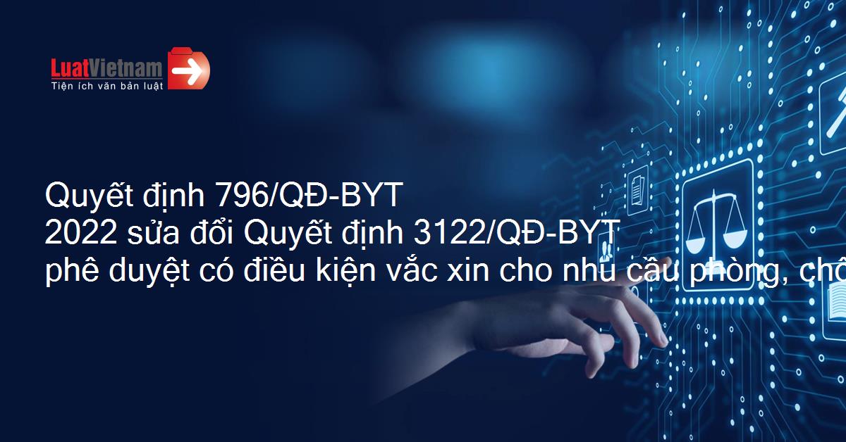 Ngày 31/3/2022, Bộ Y tế đã ban hành Quyết định 796/QĐ-BYT về việc sửa đổi Điều 1 Quyết định 3122/QĐ-BYT ngày 28/6/2021 của Bộ trưởng Bộ Y tế phê duyệt có điều kiện vắc xin cho nhu cầu cấp bách trong phòng, chống dịch bệnh COVID-19.